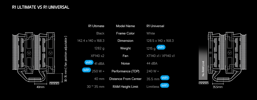 Por ello, la disposición lateral de los heatpipes y la orientación de las aletas presentan ligeras diferencias entre el R1 Ultimate y el R1 Universal. Como se muestra en la comparación, los bloques de aletas del R1 Universal están desplazados más hacia atrás en comparación con el R1 Ultimate. Esto proporciona al R1 Universal una mejor compatibilidad general en plataformas Intel LGA 115x / 1366 / 775 y AMD, incluso cuando el R1 Ultimate utiliza el mismo ventilador delgado XT140.