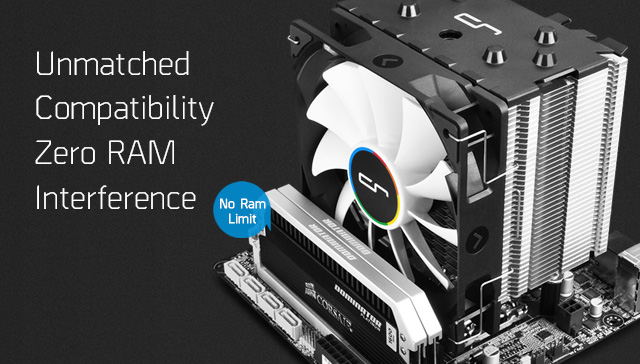 El CRYORIG H7 es la siguiente pieza en la búsqueda de CRYORIG por liderar las soluciones térmicas para PC. Dirigido a sistemas de entrada y gama media, el H7 acerca la asequibilidad y la innovación de CRYORIG a un público más amplio. Con una altura total de solo 145 mm, es casi seguro que el H7 sea compatible con el 99 % de los chasis mid-tower convencionales. Además, su diseño Zero RAM Interference permite a los usuarios instalar cualquier memoria RAM sin problemas de compatibilidad.