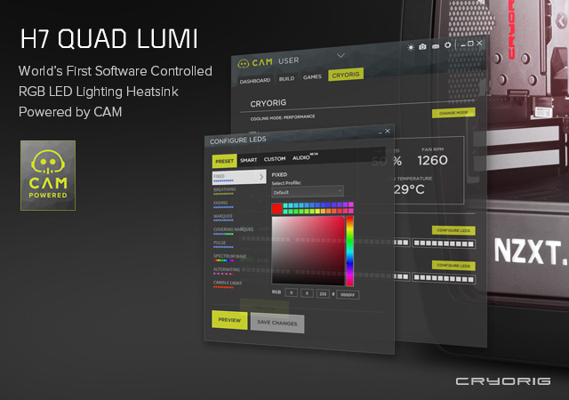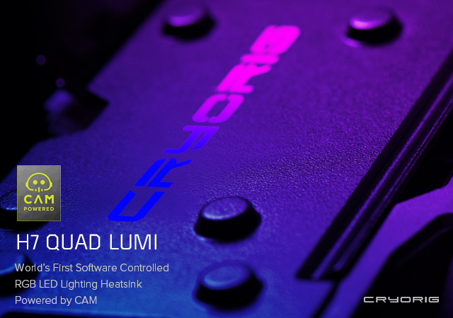 Desarrollado conjuntamente con NZXT, CRYORIG ha logrado integrar un controlador RGB LED incorporado directamente en el H7 Quad Lumi. A través del software CAM de NZXT, el H7 Quad Lumi permite ajustar la iluminación LED de doble canal tanto en el logotipo como en la base del disipador, ya sea mediante el software CAM o desde la aplicación móvil.