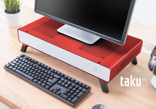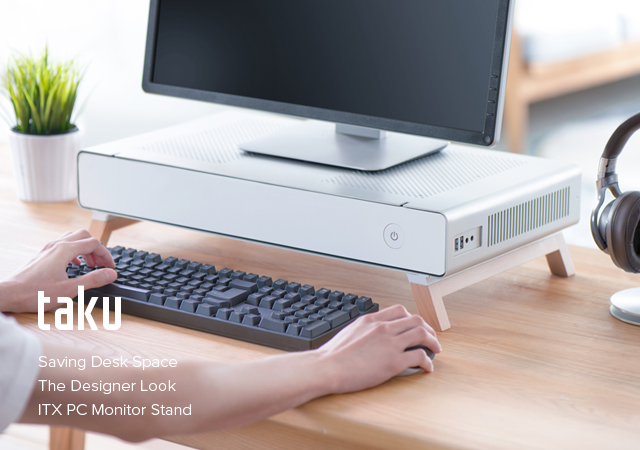 El Taku es un híbrido entre un soporte para monitor y un chasis para PC ITX de alta gama. Con el Taku, la huella del PC se reduce al mínimo para liberar espacio en el escritorio, sin renunciar a la posibilidad de montar un sistema de alto rendimiento. La ventaja de este diseño es que el monitor, el teclado y todo el sistema PC se organizan verticalmente uno sobre otro. Esto permite reducir el espacio total ocupado y liberar una valiosa superficie de trabajo.